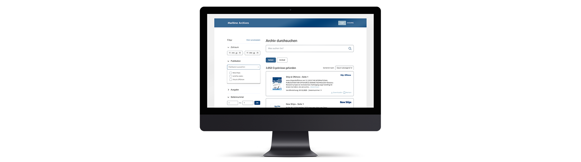 Die leistungsstarke Suche und die benutzerfreundliche Oberfläche von Maritime Archives sorgen dafür, dass Sie maritime Fachinformationen schnell, gezielt und ohne Umwege finden. Ob einfache Stichwortsuche oder präzise Recherche mithilfe von Phrasen und Filtern – die Datenbank liefert klare und relevante Treffer.