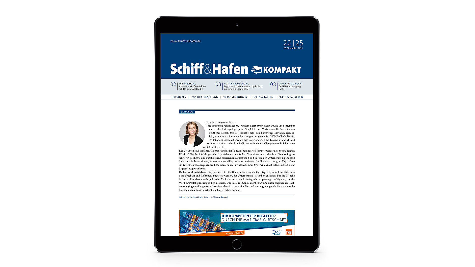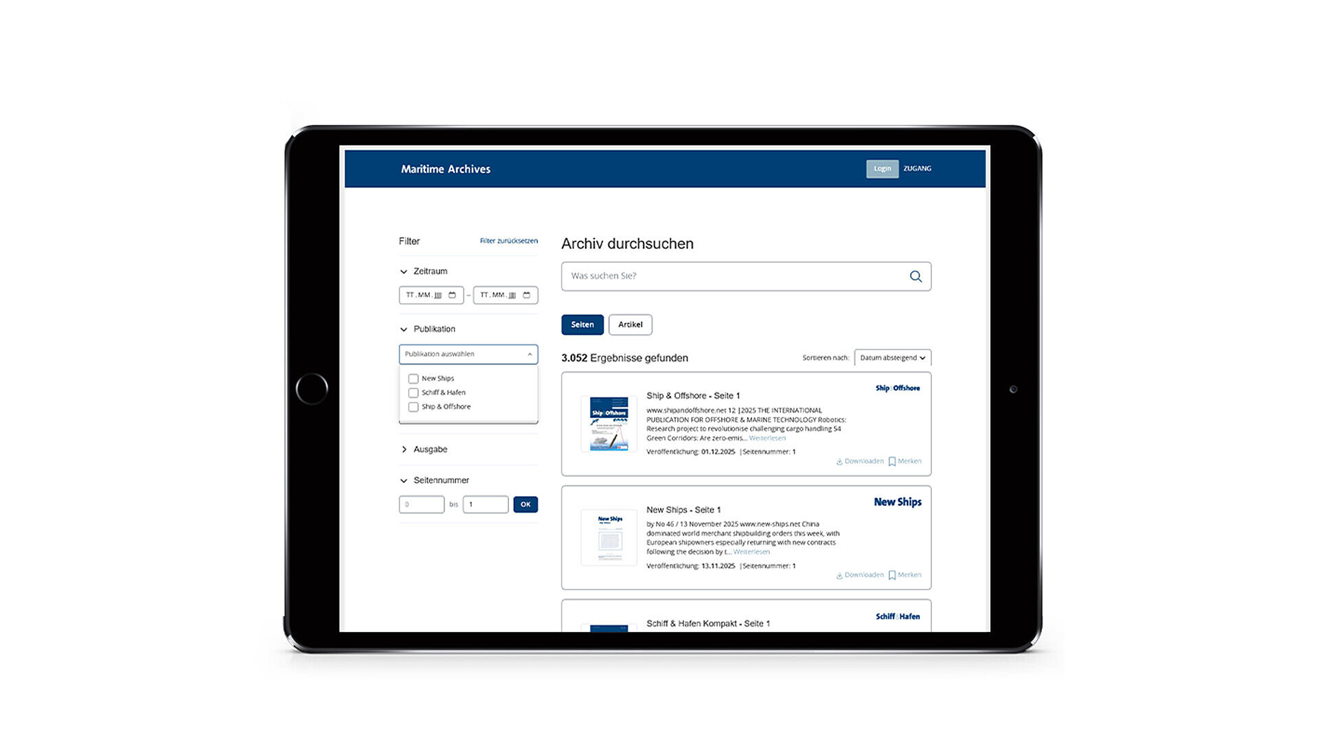 Mit dem Fachartikelarchiv „Maritime Archives“ erhalten Sie Zugriff auf alle Schiff&Hafen- und Ship&Offshore-Ausgaben seit 2010 sowie Schiff&Hafen Kompakt seit 2024 und können jederzeit darin recherchieren.