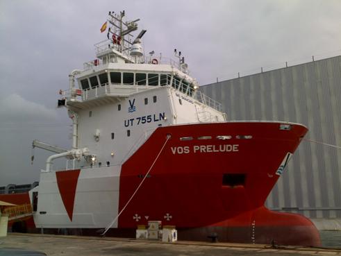 Der 73.6 m lange und 16 m breite Neubau vom Typ UT755 wurde bei Cochin Shipyard in India gabaut und hat seinen ersten Einsatz in Spanien aufgenommen. "VOS Prelude" assistiert in Charter bei der Ölplattform Hakuryu-10 des Castor Underground Gas Storage-Projekts für Cobra Castor UGS.